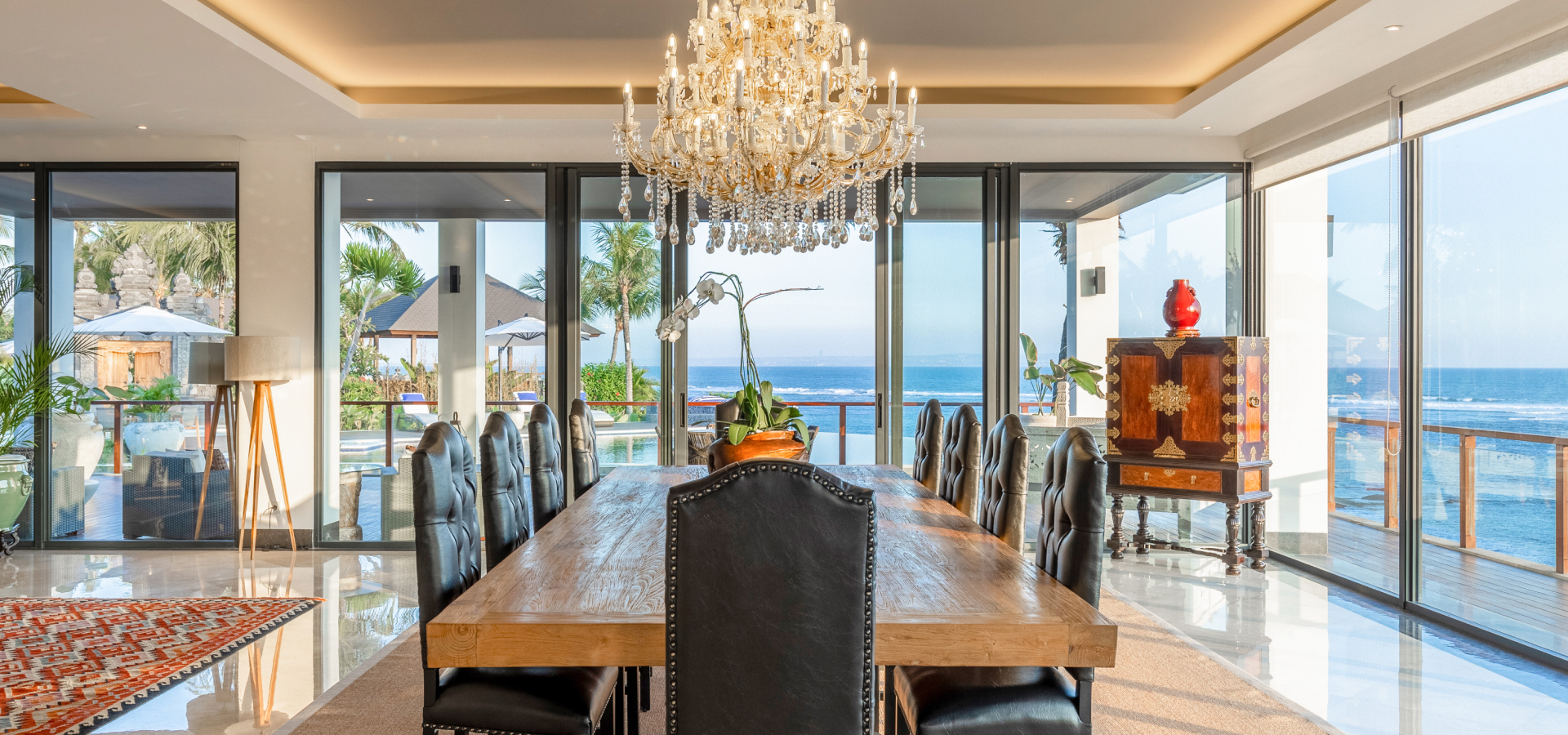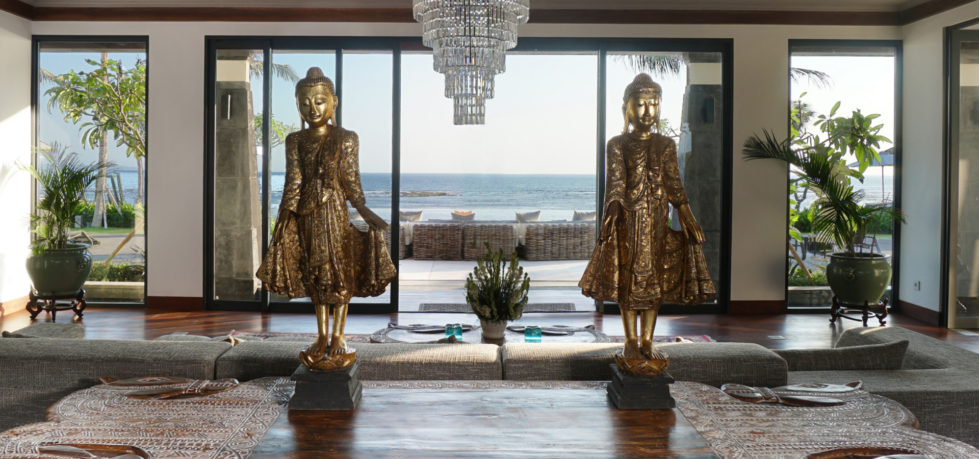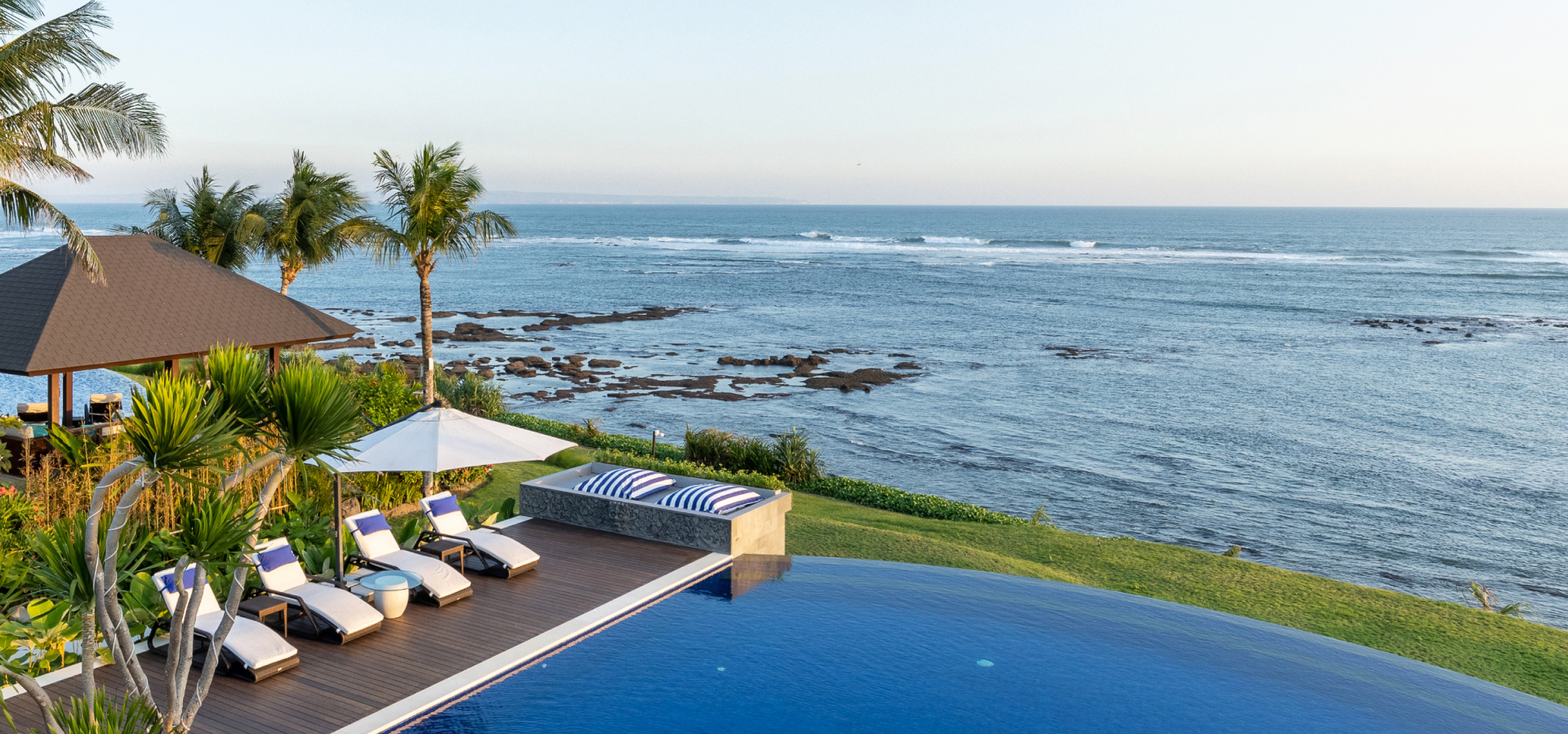 Perched atop cliffs overlooking the peaceful Cemagi black sand beach in south-west Bali, Tirtha Bayu Estate comprises two stunning villas with a total of 11 ensuite, air-conditioned bedrooms.